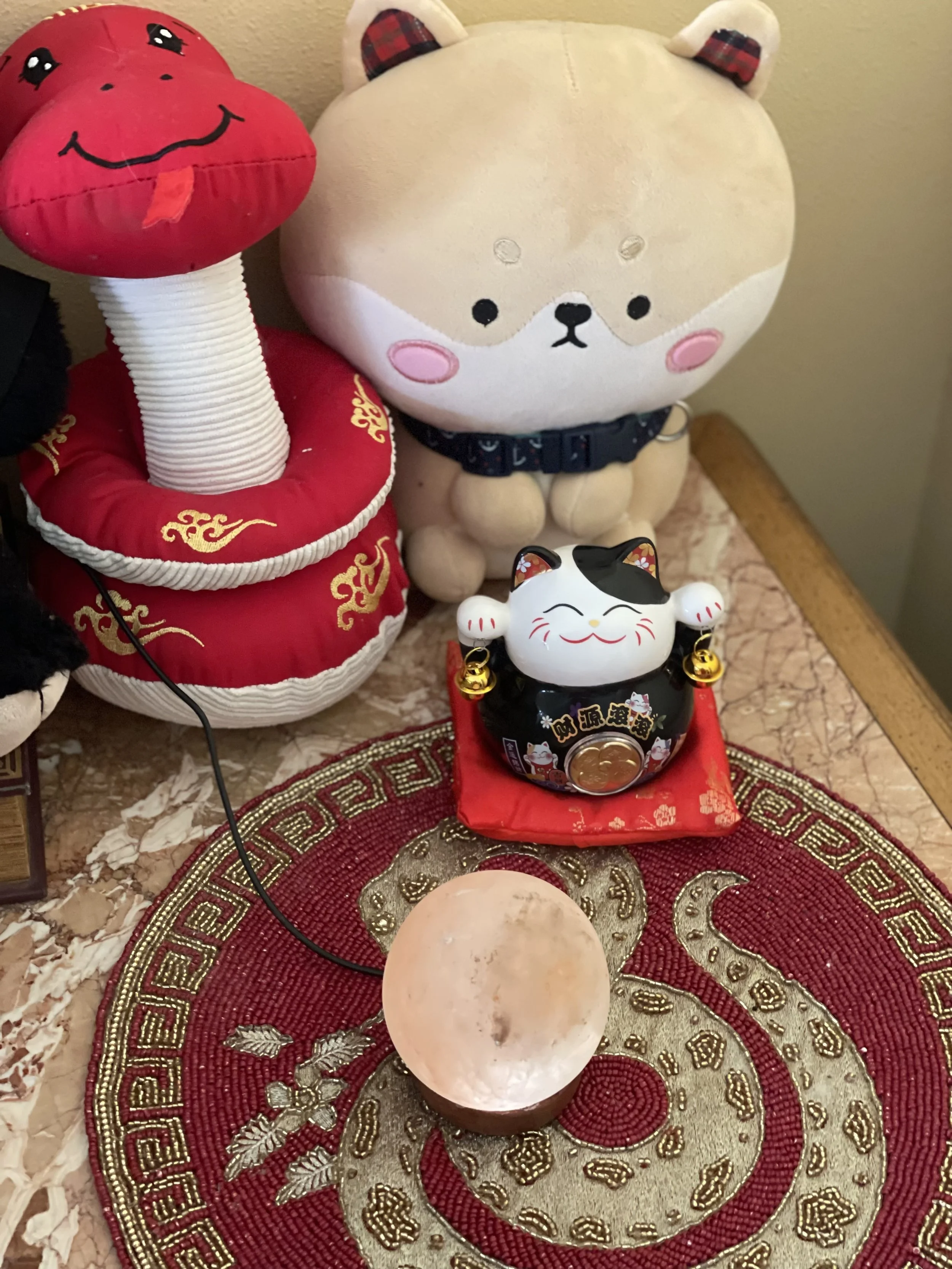 The lamp beside me? Round. Planet-shaped salt lamp. A little moon I bought on Amazon, soft salt light from a galaxy that probably knows my name. Here’s a photo. You don’t just have to believe me, you can see yourself that it’s cute as hell.